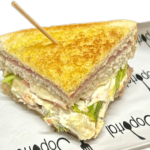 Canapé de bacalao rebozado, con cebolla caramelizada, mermelada y pimiento verde