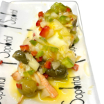Pincho de bonito, huevo, pepinillo, esparrago y langostino…
