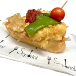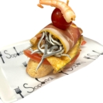 Canapé jamón serrano y gulas con calavacín, tomate y gamba.